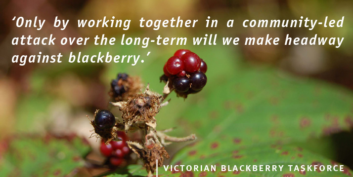 The Victorian Blackberry Taskforce (VBT) is one of four Victorian Community Weed Model Groups working in partnership with the Department of Primary ndustries and Department of Sustainability and Environment to deliver community weed control programs. The VBT delivers services that provide for the sustainable development of Victoria's primary industries and protect biodiversity assets for the benefit of the Victorian community, both now and in the future. The VBT works in partnership with those who directly manage the natural resource base including rural landholders, public land managers and local government. | Website | Contact |