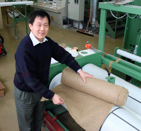 Dr Menghe Miao in the nonwovens mill at CSIRO in Geelong, Victoria, with a sample of the biodegradable weed mat. Credit: CSIRO