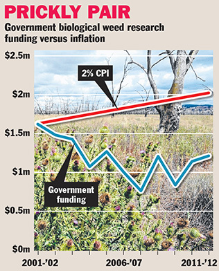 [Weekly Times 21 Dec. 2011 by Peter Hunt, p. 9] -- VICTORIA’S weed research funding has been ground down to less than it was a decade ago. Department of Primary Industries data show its 10 weed researchers and five technicians received less than $1.3 million from the Victorian Government for research, compared with $1.7 million in 2001-02. Most of the decline, which occurred under the previous Labor Government, has been masked by Federal Government funding. But the Federal Government’s $15.3 million, four-year National Weeds and Productivity Research Program comes to an end in June.In the past 20 years, the DPI team has played a crucial role in importing, screening and releasing new parasites, rust fungi and insects to control bridal creeper, Patersons Curse, ragwort, thistles, gorse, St John’s wort and other major weeds. DPI analysis shows biocontrol suppression of seven key weed species has delivered $990 million of benefits. The team also has worked on:
