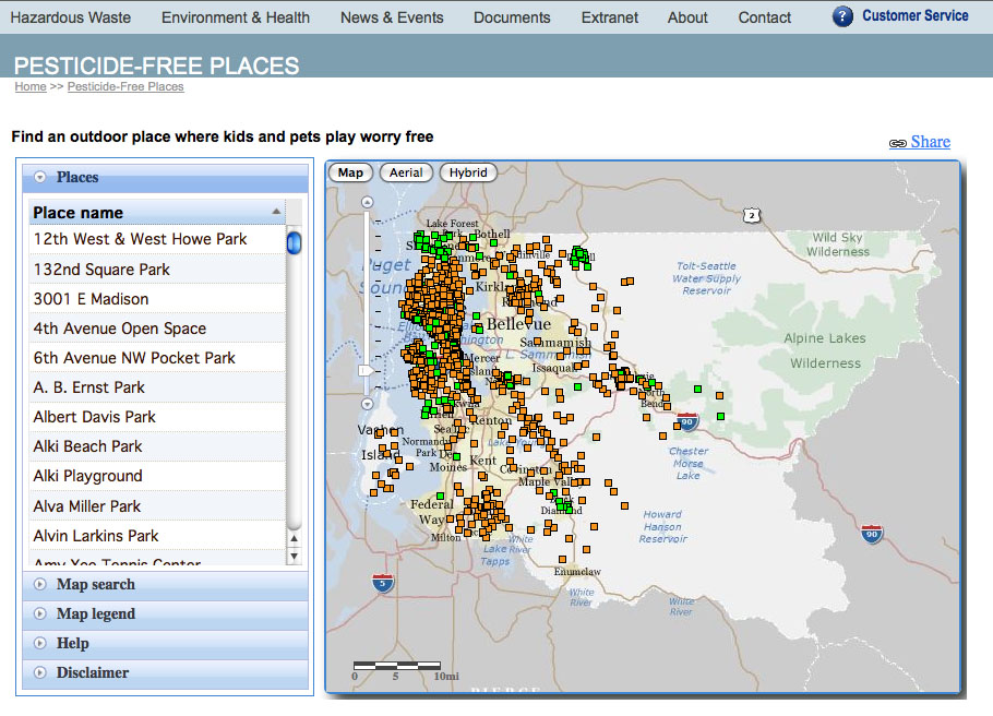 Washington: Last September, the Local Hazardous Waste Management Program in King County, WA launched an interactive online map detailing outdoor recreation areas in the county where land managers are beginning to think through issues related to pesticide and herbicide use. Beginning with five initial areas, the on-line interactive map has grown to include hundreds of areas that are marked as either a "pesticide-free place" or a "pesticide-reduced place". As we have noted in a previous news item, these classifications are not condition free. A pesticide-free place, according to the King County web-site is a place where, "No EPA-registered pesticides are used in the normal maintenance of the park or recreation area. Special exemptions are given for limited IPM (Integrated Pest Management) based use of an herbicide to remove noxious weeds as mandated by county-wide noxious weed policy, or in the case of an insecticide used to remove dangerous insects (wasps, hornets) as long as adequate notification or signage is used to warn the public." Read the signs to be sure is the take away message. Along similar lines, a pesticide-reduced place is an area where, "Children’s play areas and lawns are pesticide free. In outlying areas of the site: flower beds, fence lines, natural areas and playing fields, grounds managers use their own IPM (Integrated Pest Management) policy to determine pest control needs and minimize use of pesticides." The project is currently seeking to recruit new areas that fit these limited criteria, such as parks, private gardens, trails, arboretums, and campuses. Developers are also in the process of writing a comprehensive companion web page that will offer more resources for those seeking to minimise or eliminate their chemical use. If you are the manager of a pesticide-free area in King County and are willing to accept the conditional classification 'pesticide-free', you can request that your location be added to this map. Contact Julia Singer: julia.singer(at)kingcounty.gov or visit the King County 'Pesticide Free' Places Map.