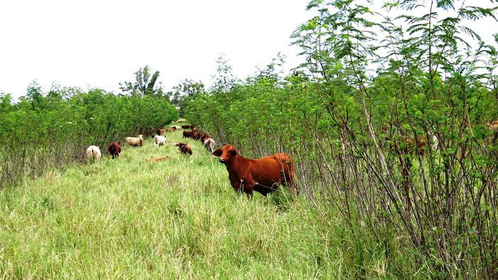 [ABC News 07 March 2012 by Kim Honan] -- Environmentalists see it as a weed, but for graziers it can mean a substantial profit. Although leucaena (Leucaena leucocephala) is not declared a pest plant under Queensland legislation, it hasn't stopped one local council declaring it a weed in its region. Leucaena is used as a forage legume for cattle mainly in the central and southern parts of the state. Dingo grazier Luke Comiskey says the benefits of growing leucaena are evident. "We've been grazing it quite heavily, it's going really well, getting a very high stocking rate from it and an even better weight gain as well so you're getting a double benefit," he said. "Probably one of the better things you can do with your money is put it into planting leucaena, it just gives you so much more scope." But for graziers further north in the Whitsunday region, growing leucaena will now involve the approval of a management plan by the local council, after it decided to declare it a weed. Whitsunday Regional Council's Scott Hardy says leucaena is an invasive plant and infestations of it have increased in the region in recent years. "With leucaena now being a locally declared weed this gives council a little bit of power to work with landholders a little bit more but also issue compliance orders to try to get landholders to control their infestations," he said. "Leucaena's okay when it's in a managed situation but when there's a bit of a lax in management and the seeds escape the grazing property into the creeks, that's where some problems and infestations can occur." [Photo caption: Cattle graze on leucaena near Rockhampton, Queensland. (DEEDI)]r905970_9253012.jpg