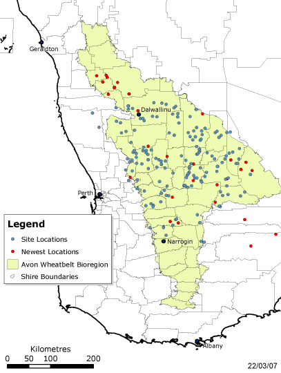 Woodland Watch is a collaborative project involving WWF-Australia and the Herbarium of the Western Australian Department of Environment and Conservation, with the assistance of funding from the Natural Heritage Trust and Alcoa World Alumina Australia. A major objective of the project was to carry out floristic surveys of selected remnant eucalypt woodlands of the Avon region — all on private farmlands. The Avon wheatbelt region is situated in the South West Botanical Province of Western Australia and is largely bound by Jarrah forest in the south west, and by the Murchison and goldfields districts of the Eremaean Botanical Province to the north east. It encompasses an area of 93,520 square kilometres, of which 93% has been cleared.