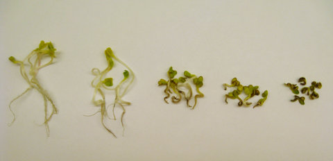 [The New York Times 27 April 2012 by Josie Garthwaite] -- Science fiction might have us believe that tiny particles seeping into soil and altering plant DNA will lead to the rise of giant killer tomatoes. But a new study suggests that exposure to certain nanoparticles may in fact have a shriveling effect on some plants. Researchers with the National Institute of Standards and Technology and the National Institute of Standards and Technologyhave documented the first findings that engineered nanoparticles can enter plant cells and damage their DNA. In laboratory experiments, researchers led by Bryant C. Nelson, a NIST biochemist, tested copper oxide nanoparticles ranging in size from one nanometer to 100 nanometers. For comparison, the head of a pin measures about one million nanometers across, and a human hair is generally around 60,000 nanometers in diameter. As controls, the scientists also tested larger copper oxide particles and copper ions. They found that exposure to nano-scale copper oxide particles stunted the shoots and roots of radishes and two species of rye grass. Plants exposed to the highest concentrations of these nanoparticles, which are commonly used as industrial catalysts, were the most severely stunted. And radishes took up significantly more copper from the nanoparticles than from larger copper oxide particles. “What we learned at the bottom line is these nanoparticles do have the ability to enter the environmental stream, to enter specific plant systems,” Dr. Nelson said in a telephone interview. “Once you reach a certain level of excess copper, especially if it can enter the nucleus, then it has the possibility to damage the DNA.” [Photo: H. Wang/Environmental Protection Agency: At left, a radish plant exposed to no copper nanoparticles, and then a range of concentrations, culminating in 1,000 parts per million at right.]