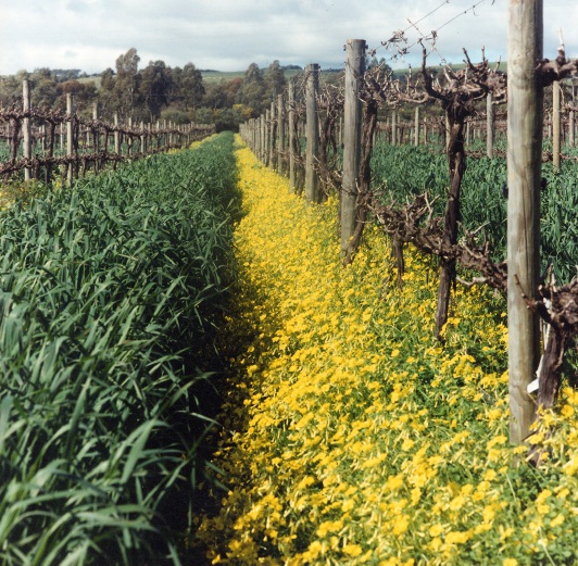 Abstract: The mid-row area accounts for about 70% of the vineyard floor, and weed management is the principal reason for activities on this area. Many growers have now changed their thinking about plants growing of their own volition in the mid-row, from being weeds requiring control to plants providing low-cost soil cover. Cover cropping is also widely practiced, utilising a wide range of native or exotic species to provide particular benefits such as weed or nematode suppression, biological nitrogen, high or low water use, and beneficial insect habitat. The capacity for cover crops to compete with weeds varies considerably between species. Cereals, especially barley, and to lesser degrees wheat, triticale, rye and oats, are strong competitors. Fodder turnip also displays strong early growth to compete with weeds. Dense stands of medics and sub-clovers generate large amounts of spring biomass, and will compete strongly, particularly in nitrogen deficient soil. Perennial ryegrass and medics/sub-clover are also a very compatible mix for weed control. Once established, native species such as perennial prostrate saltbush (Atriplex semibaccata) and wallaby grass (Austrodanthonia richardsonii) are also very strong competitors. Saltbush is very suitable for use as a mid-row planting in the dry inland regions where it provides habitat for beneficial insects and suppresses the growth of caltrop (Tribulus terristris). Wallaby grass is well suited to the 300-500mm rainfall zone and effectively suppressed the growth of caltrop and wireweed (Polygonum spp.). [Chris Penfold & Cassandra Collins (2012). Cover crops and weed suppression. Fact Sheet June 2012: University of Adelaide][Caption: Soursob growing undervine during winter suppresses the growth of other plants. (Photo courtesy Joch Bosworth)]