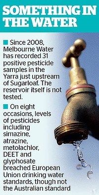 [SMH 17 June 2012 by Stephen Cauchi] -- PESTICIDES have been detected upstream of a reservoir that feeds Melbourne's drinking water supply, sparking calls by an environmental group for an urgent upgrade of the dam's filtration and treatment plant. On eight occasions in 2010-11, the levels of pesticides, including simazine, atrazine and DEET, at Sugarloaf reservoir, north-east of Melbourne, were recorded above safe European Union drinking water standards, according to Melbourne Water data obtained by Friends of the Earth through freedom of information. The pesticide levels were within Australian safety limits, but Friends of the Earth spokesman Anthony Amis said it highlighted problems with the Winneke treatment plant at Sugarloaf, which ''was never intended to filter out pesticides''. ''We'd argue that as a precautionary principle the treatment process at Winneke should be upgraded to filter out these pesticides. Elsewhere in Australia, activated carbon has been used to filter out pesticides.'' Sugarloaf is one of three Melbourne reservoirs where the water has to be fully treated and the only one fed by the Yarra River. Before reaching Sugarloaf, the Yarra passes through some intensively farmed and sprayed properties, including several vineyards. 'It is clear to us that there is probably no other place in Victoria, other than near Werribee, where there'd be such a heavy use of agricultural chemicals,'' Mr Amis said. Half the pesticides detected in the upper Yarra, including simazine and atrazine, were ''endocrine disrupters'' that could interfere with hormonal development, he said. Atrazine can turn male frogs into female frogs, while in humans it has been associated with birth defects, low birth weights and menstrual problems. Mr Amis said there was a strong case for Australia to adopt stricter standards, which are currently set at 20 parts per billion, compared with 0.1 parts per billion in Europe. Melbourne Water's own risk assessment - published in the Friends of the Earth report, Issues regarding Melbourne drinking water and pesticides - stated that ''of any of the catchments, biocides are most likely to be found in Sugarloaf''. Melbourne Water also acknowledged that ''the health impacts of biocides are uncertain and generally of a chronic nature. ''It is possible that long-term exposure could cause cancer within a subset of the population resulting in shortened life expectancy in some people.'' It also acknowledges that the impact of biocide contamination would be ''catastrophic''. Since 2010, Friends of the Earth has resisted attempts by the Eastern Golf Club to open a new course at Yering, one kilometre upstream from Sugarloaf, over fears chemicals used to maintain the greens could be washed into the reservoir in the event of a flood.