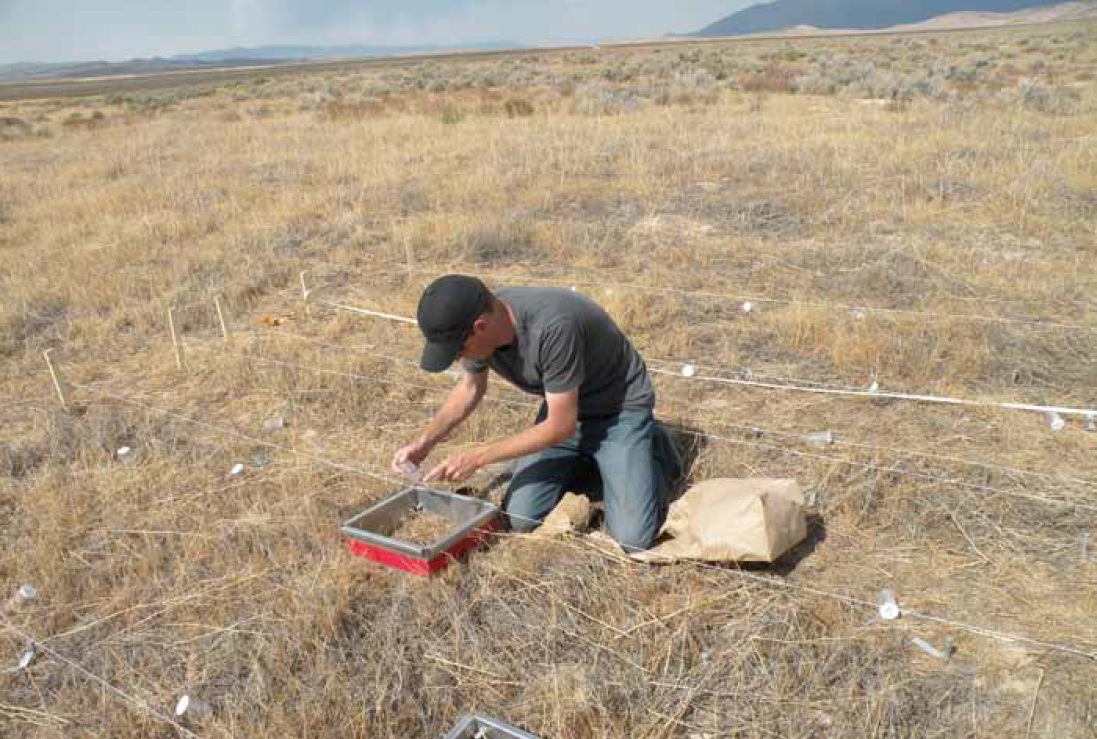 Abstract: Cheatgrass and its cousin, red brome, are exotic annual grasses that have invaded and altered ecosystem dynamics in more than 41 million acres of desert shrublands between the Rockies and the Cascade-Sierra chain. A fungus naturally associated with these Bromus species has been found lethal to the plants' soil-banked dormant seeds. Supported by the Joint Fire Science Program (JFSP), researchers Susan Meyer, Phil Allen, and Julie Beckstead cultured this fungus, Pyrenophora semeniperda, in the laboratory and developed an experimental field application that, in some trials, killed all the dormant soil-banked Bromus seeds, leaving none to germinate the following year. The team's work opens the way to a commercial biocontrol product that may be capable of safely eliminating the seed bank of persistent invasive grasses. Biocontrol could be used in conjunction with other weed control measures and conservation strategies to make sagebrush-steppe lands less susceptible to reinvasion. A biocontrol tool effective against Bromus seeds would be a boon to managers working to restore the native bunchgrasses, forbs, and shrubs that characterize an intact shrub-steppe ecosystem. [Wells, Gail (2012). Cheating cheatgrass: New research to combat a wily invasive weed. Fire Science Digest. 13(May): 1-8.] [Photo:Thomas Stewart, Brigham Young University graduate student on Susan Meyer’s research team, inoculates field plots with P. semeniperdainoculum. Credit: Susan Meyer] Comment