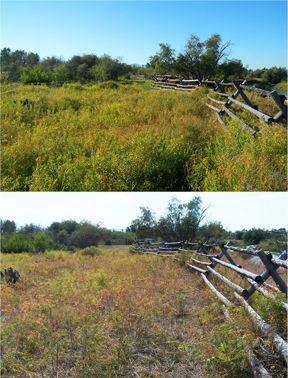 This is an example of the progress trained heifers made on reducing leafy spurge in pasture at Grant-Kohrs Ranch National Historic Site in Deer Lodge Montana. Pictures were taken in early August of 2005. After the fence was taken down and cattle had access to a mown hayfield, they returned to this pasture on their own and finished off the leafy spurge. Click on the picture to read more about cattle learning to eat leafy spurge.