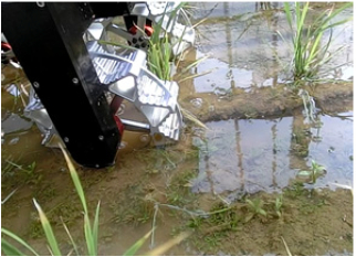 Abstract: The research was conducted to develop a robot that can navigate a paddy in between rows or hills which were transplanted by the machine transplanter with equal distance. An initial prototype robotic battery-type weeder was manufactured and tested to navigate and control weeds in rice paddy fields, but a speed was so slow, and thus second engine-type prototype was developed. A working acreage for weed control has been attained at and up to 0.8 ha/day. Small and young weed seedlings were uprooted and destroyed by passive devices in between rows as well as hills. This robot was smoothly navigated in between rows on behalf of the guidance under camera and sensor systems and control weeds with mechanical by the use of implements such as passive rotary weeders and then weeds would be cut and buried into the soils. Also muddy water was generated during operation which was none penetrated by light for weed germination to occur. The authors concluded that the robotic was an effective alternative implement to control weeds in lowland rice paddy as long as this tool was systematically introduced into the rice fields at three time intervals, viz. 15-20 days, 25-30days, and 35-40 days after transplanting of rice seedlings. [Kwang Ho Park, Soo Hyun Kim, Young Kuk Kim, Han Jong Joo, Yoon Shik Hong, Jee Hyong Kim & Keun Mo Koo (2014). A Potential Weed Control-Using Robotic Implement. Journal of Life Sciences, 8(5), 473-480] Comment