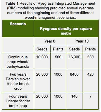 The trial used RIM modelling to assess plant populations over 10 years. At the beginning of a 10-year rotation, the number of ryegrass seeds was 20,000 per square metre, with ryegrass plant density at 1000/