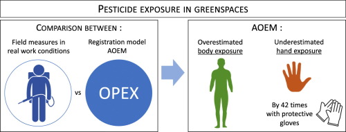 The model overestimated body exposure for all observations and there was no correlation between values. However, it underestimated hand exposure by 42 times and it systematically underestimated the exposure when the operators were wearing gloves, especially during the application. The model failed at being conservative regarding hand exposure and highly overestimated the protection afforded by the gloves. At a time of glyphosate renewed approval in Europe, non-controlled field studies conducted by academics are needed to improve AOEM model, especially in the non-agricultural sector. Indeed, among the 34 studies included in the model, none were conducted on a non-agricultural area and only four assessed the exposure when using a knapsack sprayer. Moreover, knapsack sprayers being the main equipment used worldwide in both agricultural and non-agricultural settings, it is also crucial to integrate new data specific to this equipment in the model. Operator exposure should be estimated with accuracy in the registration process of pesticides to ensure proper safety as well as in epidemiological studies to improve exposure assessment.