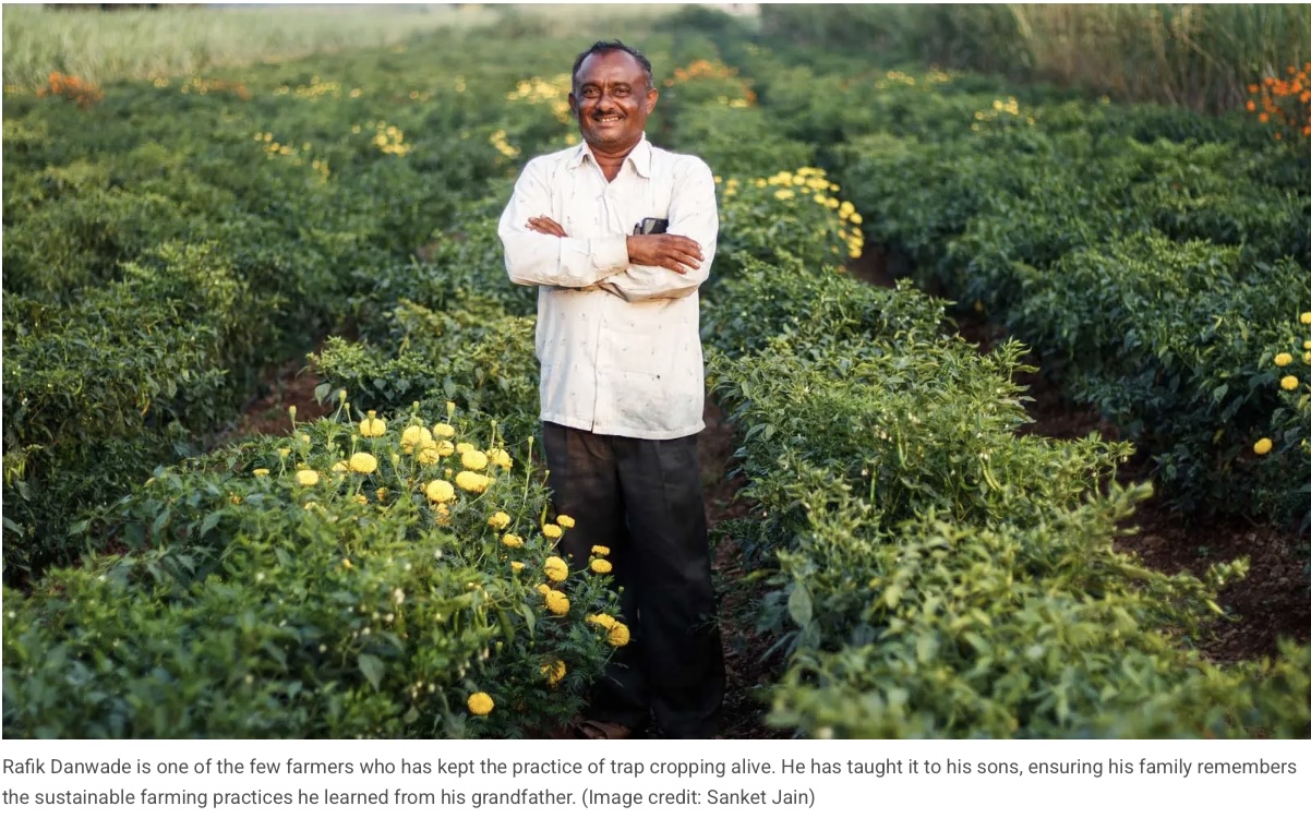 Trap cropping has given Danwade (pictured) a sustainable way to protect his chilies and boost his profits. Marigolds not only deter pests; they also attract bees and other pollinators that aid chili production.He also sells his marigolds, which are essential for daily prayers and decorative garlands in India.