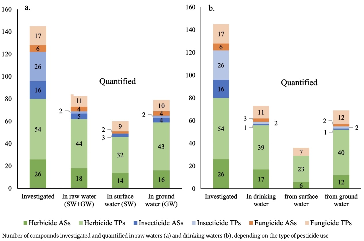 Among the transformation products, chlorothalonil R471811 and metolachlor ESA were the most frequently quantified compounds, with quantification in more than 50% of raw and drinking water.