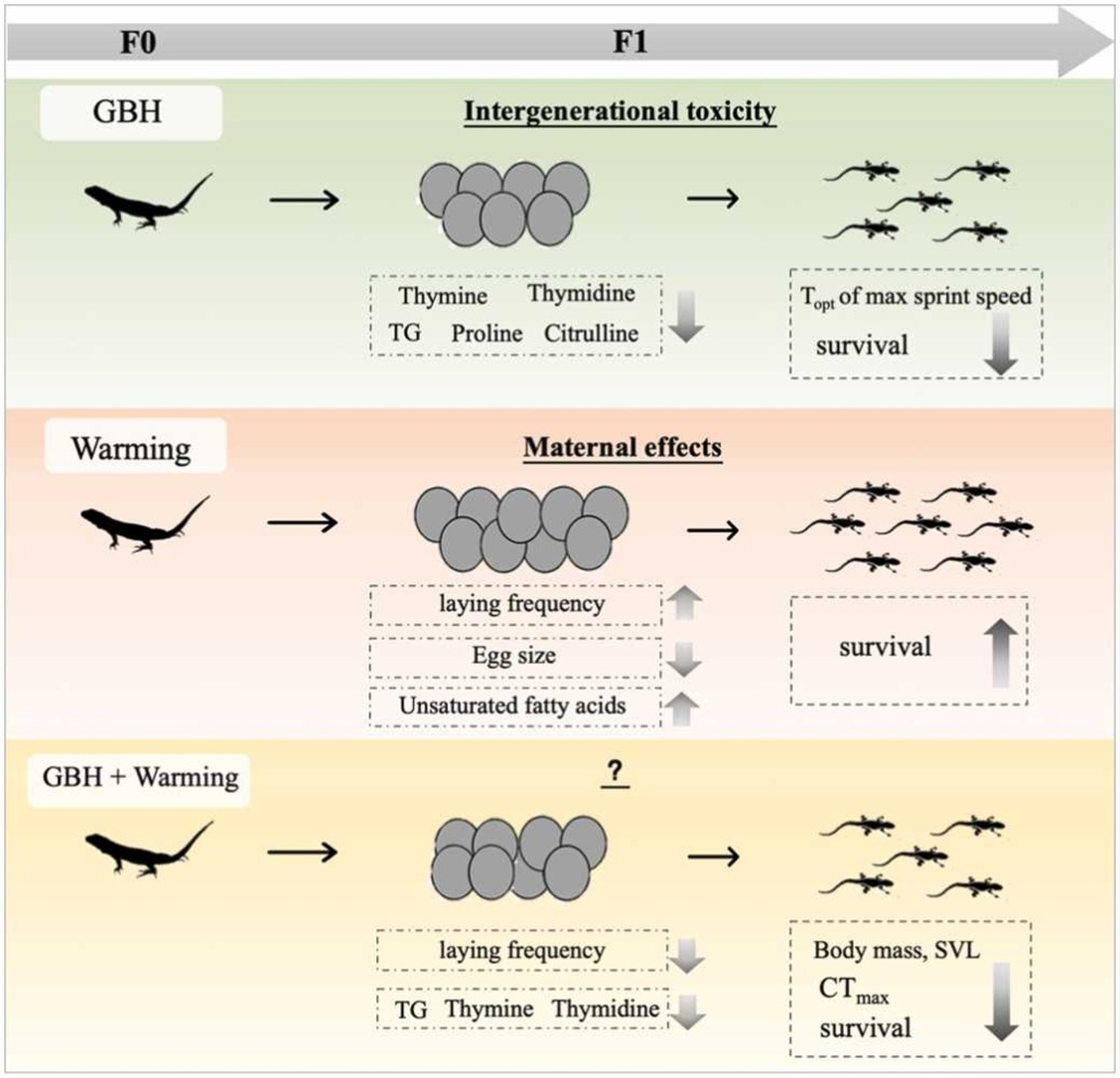 GBH exposure in a warming environment led to reduced reproductive frequency, lower hatching rates, smaller hatchlings and decreased offspring thermal tolerance, diminishing the benefits of maternal effect. These effects may be linked to reduced levels of nucleotide metabolism-related substances, triglycerides, proline, and citrulline in eggs.